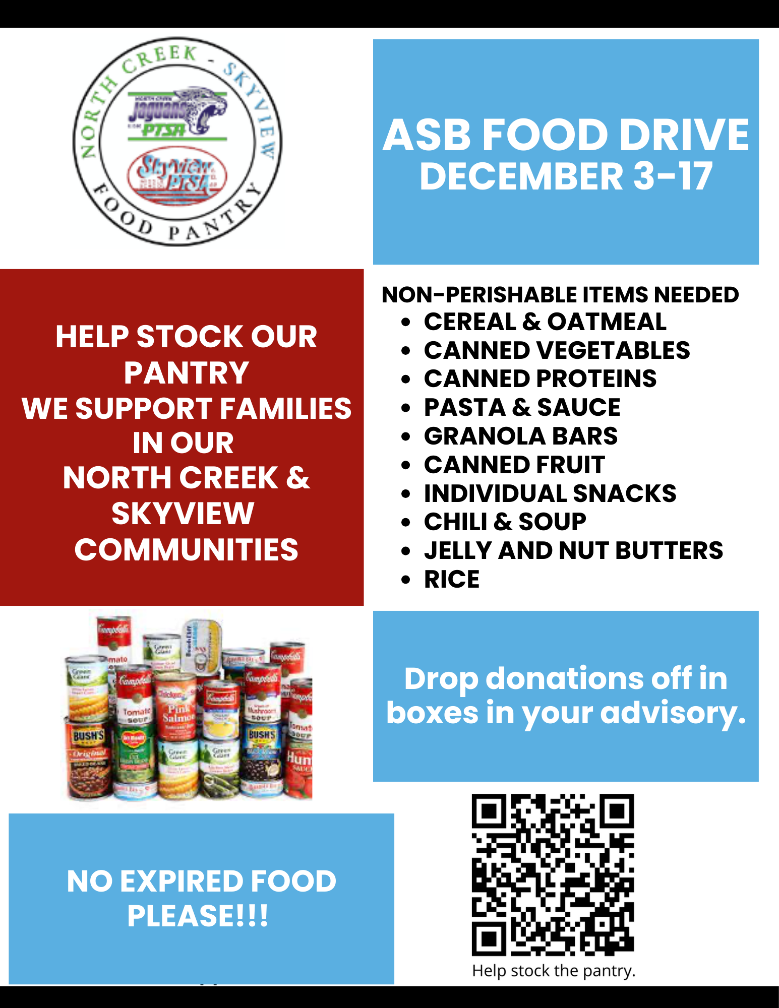Skyview ASB's annual Skyview Holiday Food Drive will run from Wed 12/3 through Wed 12/17. The drive is run by the students in ASB, and is a school wide event!
