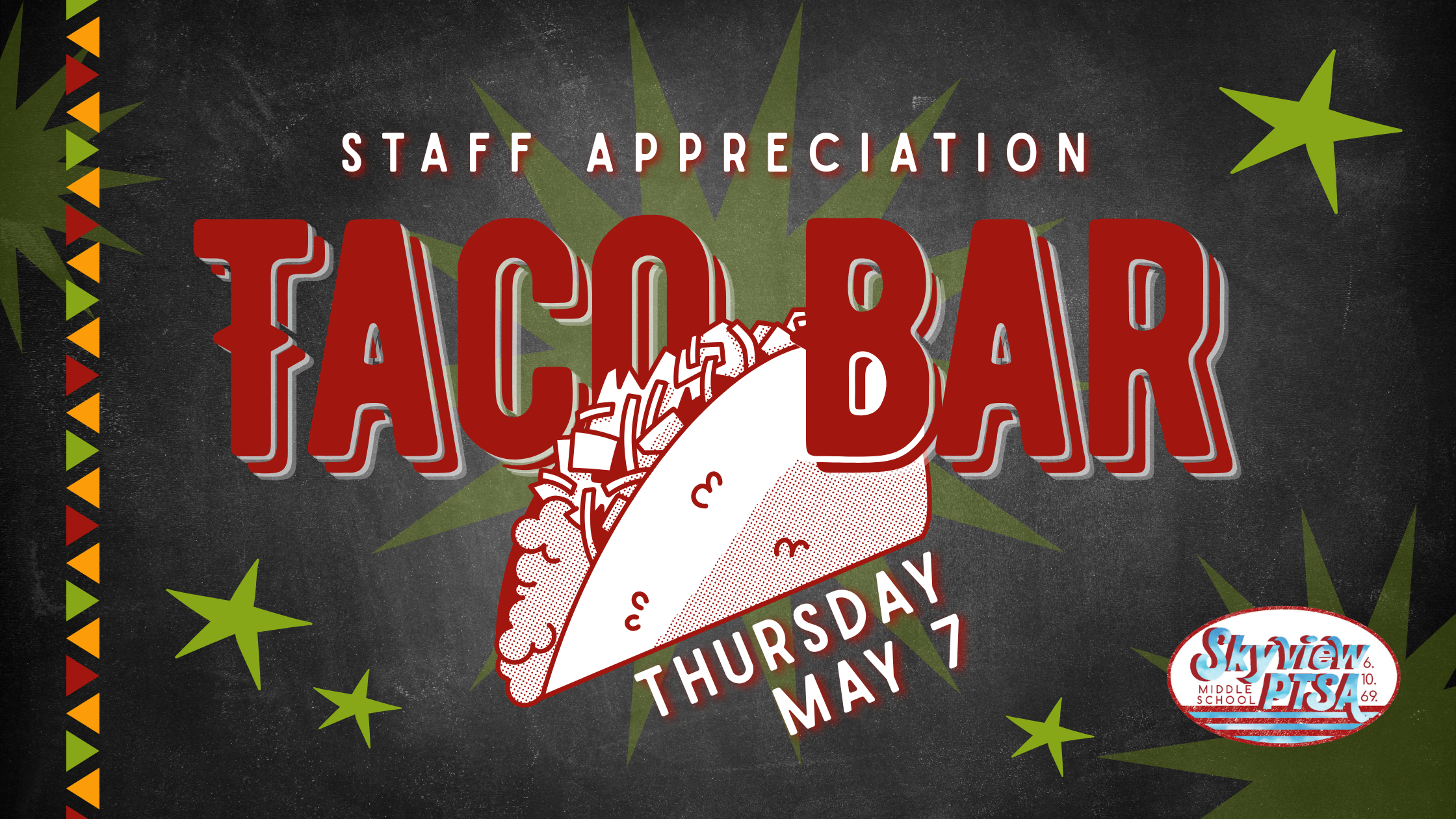 School Staff Appreciation Week is the week of May 4th! So we are doing TWO events this week. The second is a TACO BAR - who doesn't LOVE TACOS!! We plan to offer multiple proteins, "shells" and condiments for the tacos! Check out how to help out below...